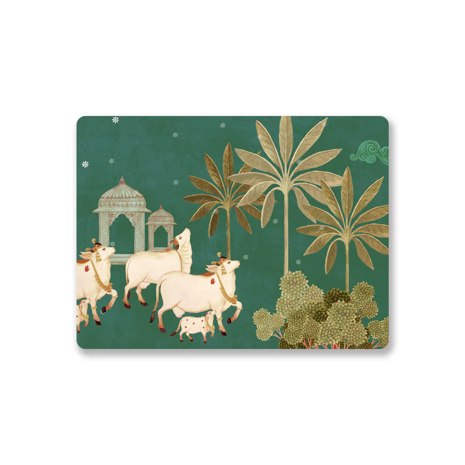 featuring a serene depiction of walking cows that exude cultural richness. Elevate your dining experience with a touch of heritage and elegance, as these mats seamlessly blend tradition with contemporary charm. Infuse your dining space with the tranquil aura of Bovine Bliss table mats in a varient colour.