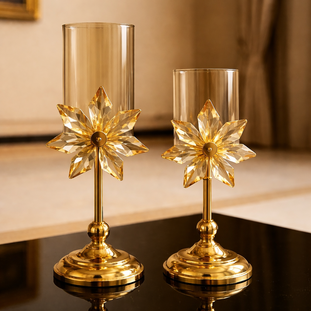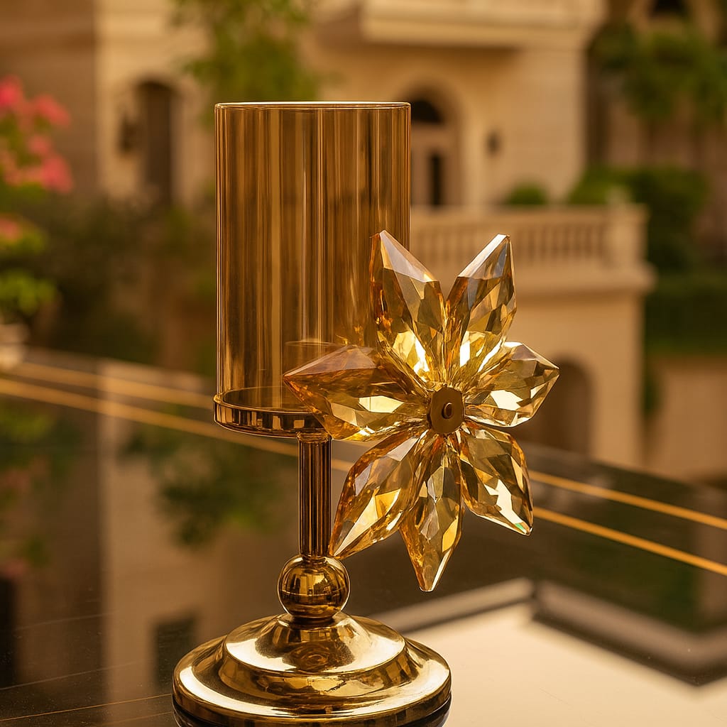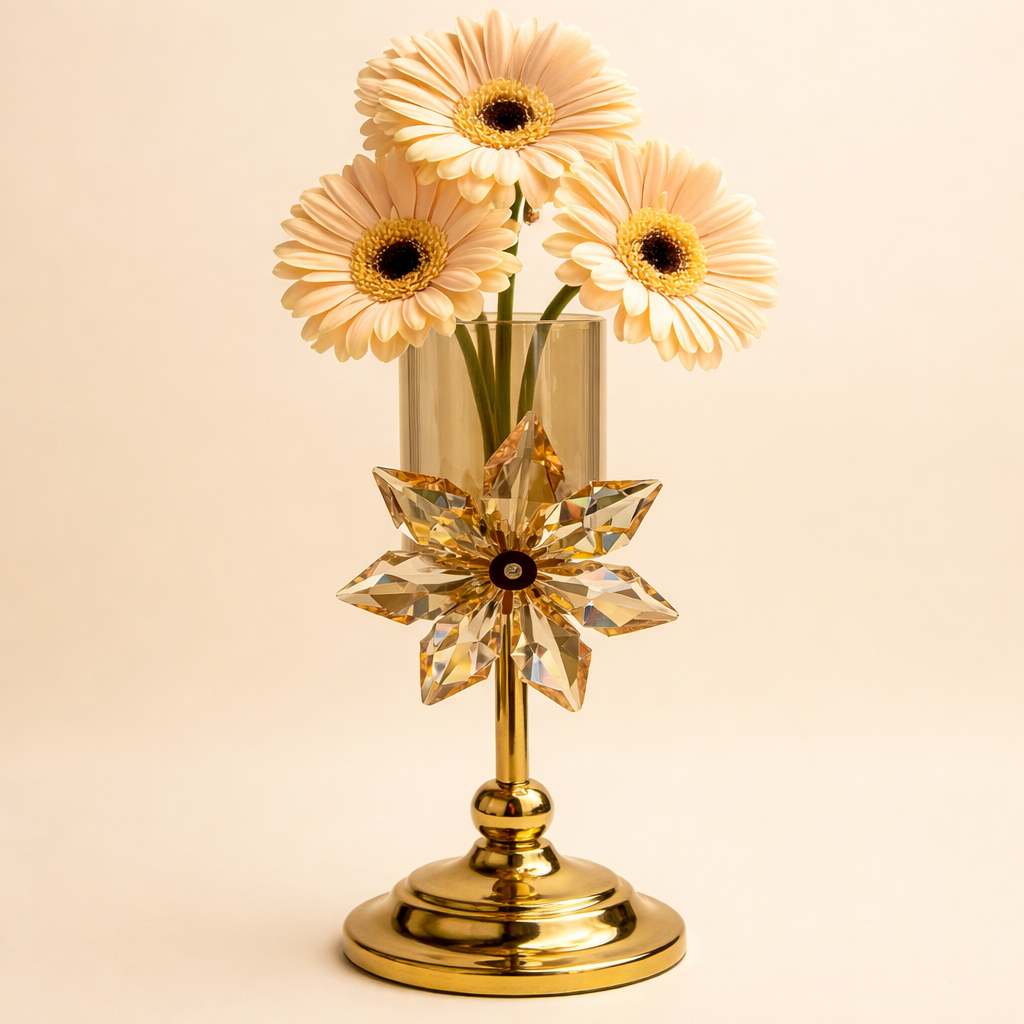An exquisite blend of elegance and luxury, the Crystal Bloom Candle Holder Vase is crafted in a lustrous golden finish with a stunning crystal flower accent. Its versatile design allows it to be used as both a candle holder and a vase, making it a timeless centerpiece for your tablescape. Whether styled with fresh blooms or lit candles, it radiates opulence and charm.