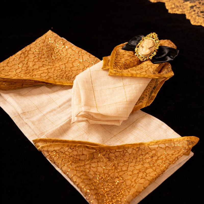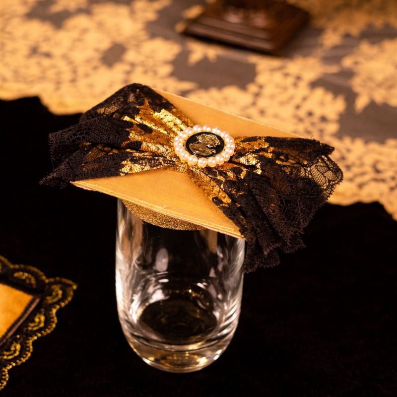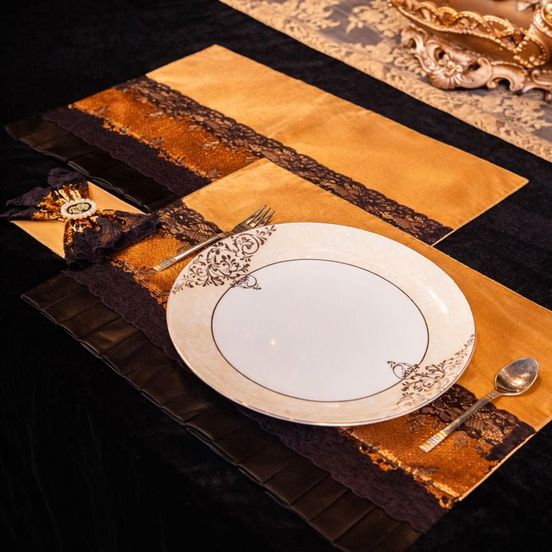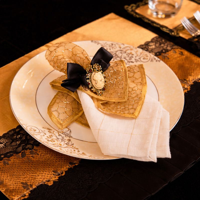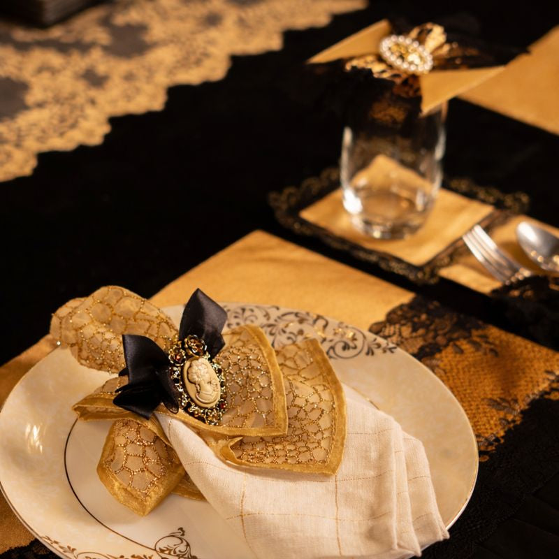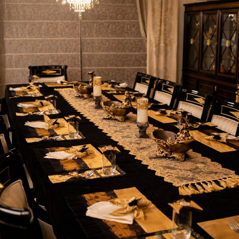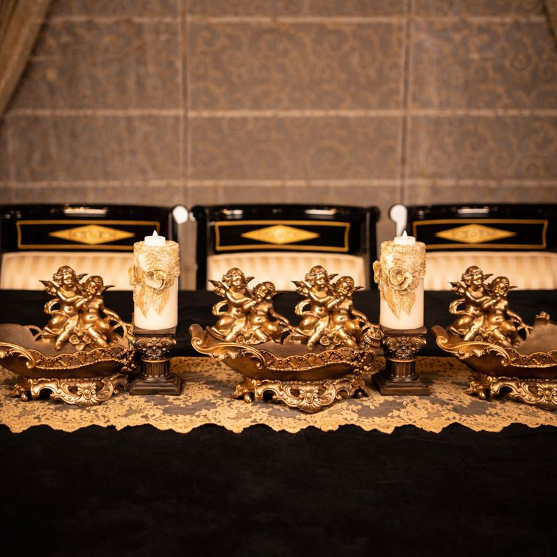A luxurious black and gold themed dining table setup featuring an opulent lace runner in golden embroidery placed over a rich black velvet base. The centerpiece arrangement showcases ornate gold-toned cherub sculptures sitting atop intricately carved bases with floral detailing, designed in an antique royal style. Between these sculptures are ivory pillar candles adorned with golden lace and embellishments, elegantly mounted on decorative stands. The background features regal high-back chairs with black lacquered frames, golden inlays, and cream cushioning, enhancing the royal appeal. The overall setup radiates Baroque-inspired grandeur, sophistication, and timeless elegance, making it perfect for luxury dining, festive celebrations, or royal-themed décor.