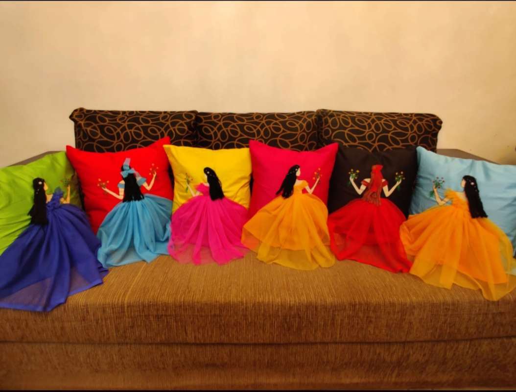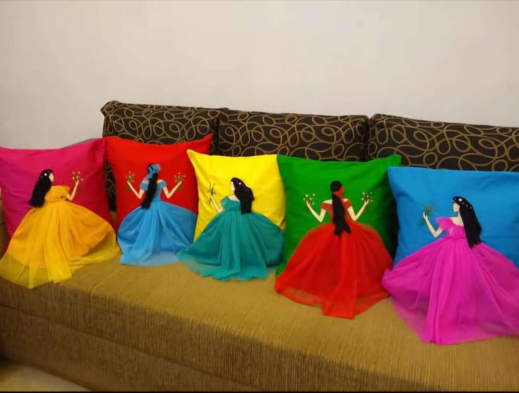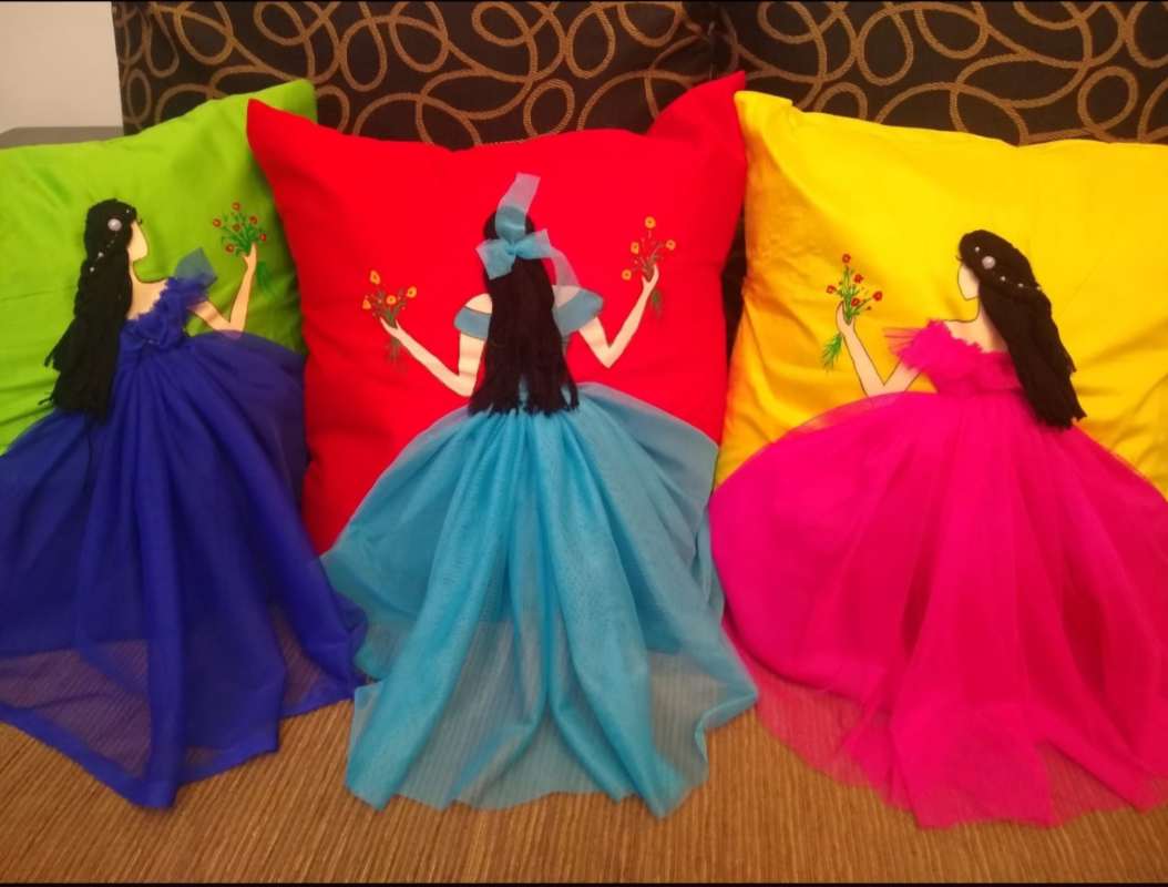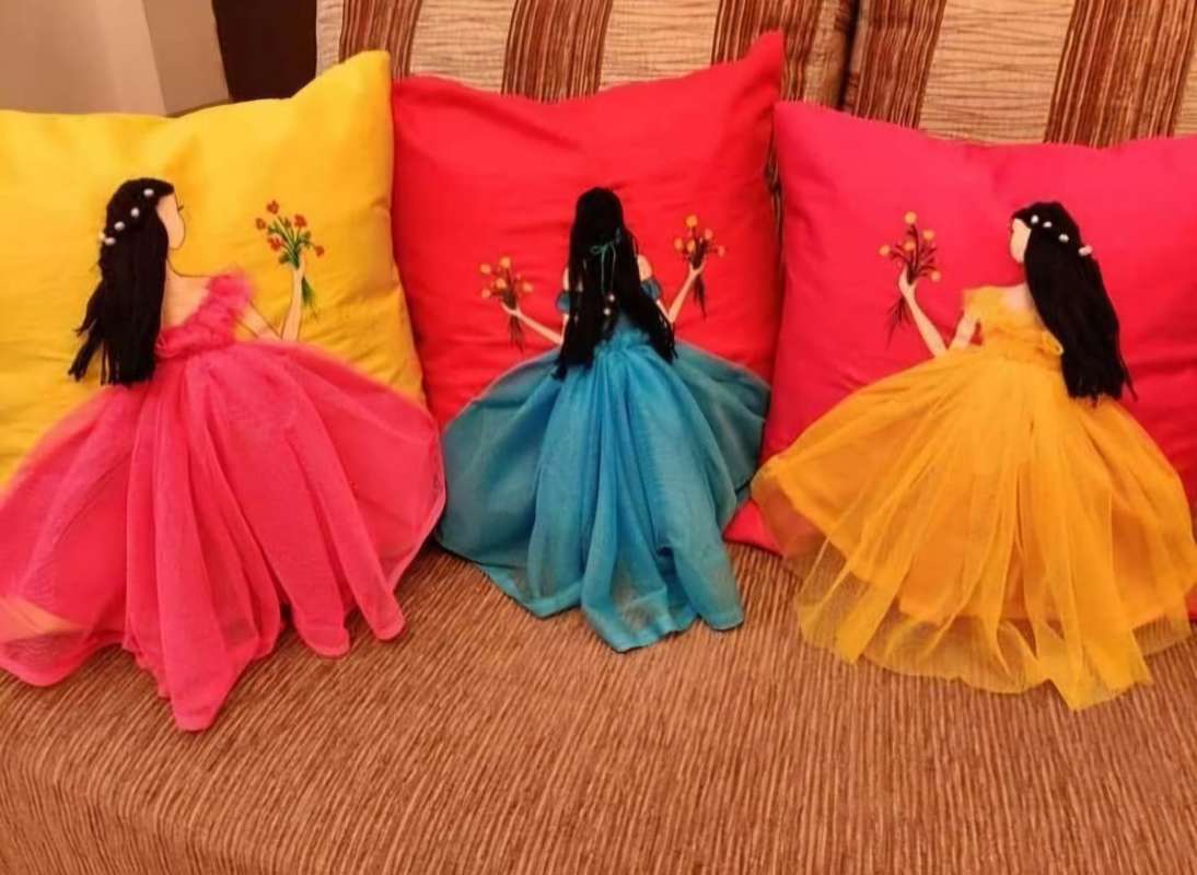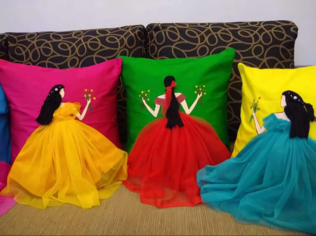 Each cushion showcases a different colored gown made from flowing fabric, creating a 3D effect. Ideal for creating a playful and charming decor, this cushion set is both stylish and fun. Perfect for gifting or decorating children’s spaces!
