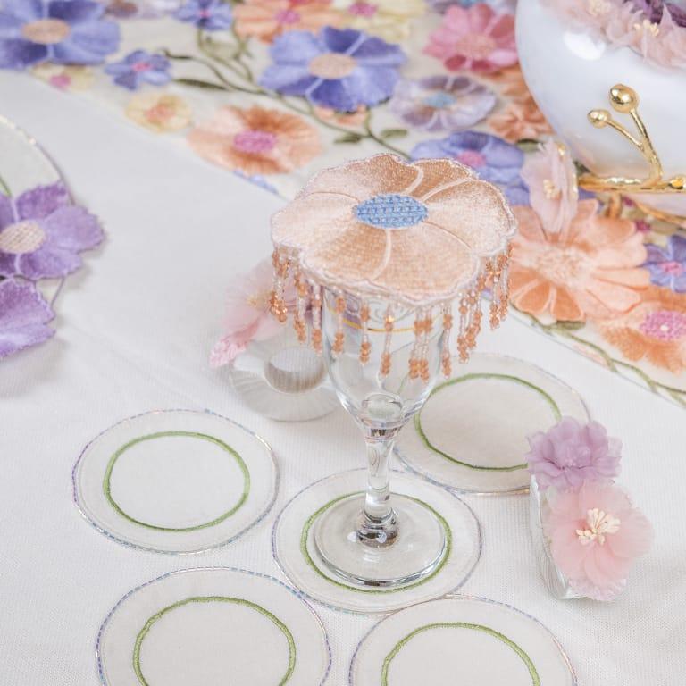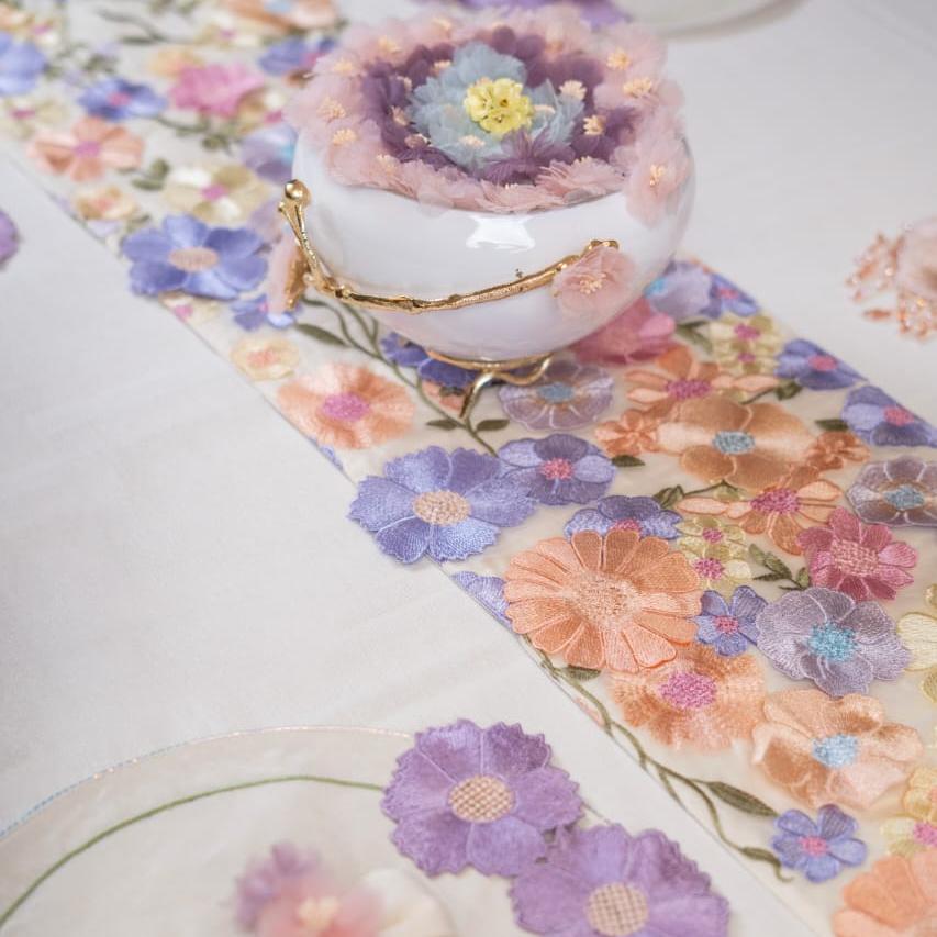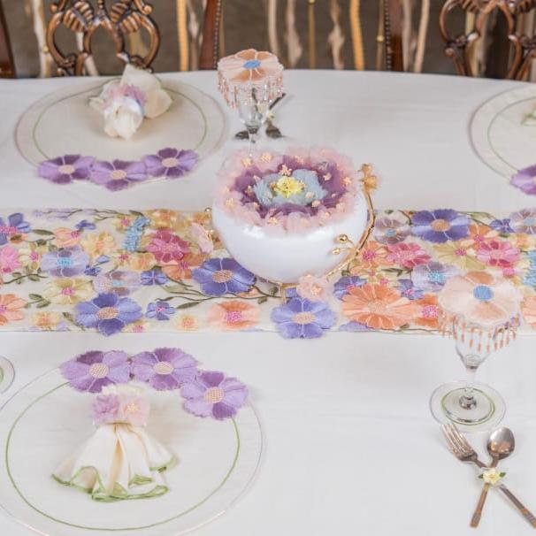 The full bloom theme feels like a royal garden where luxury is expressed through refinement, softness and exquisite detail. Draped in pristine ivory, the table becomes a canvas for delicate artistry elevated by a hand-embellished floral runner that flows gracefully through the centre like a blooming silk tapestry.