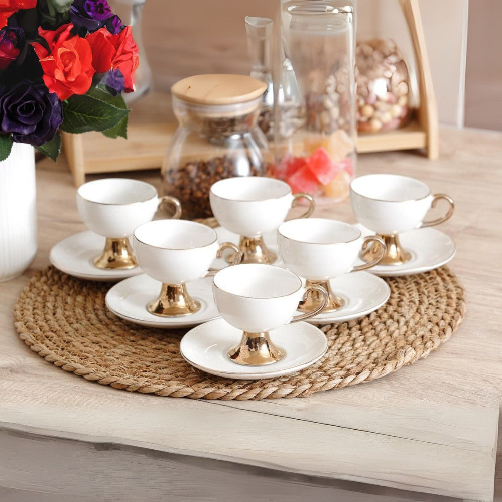 Paired with intricately grooved golden saucers, this set adds a regal charm to your tableware collection. Whether you're entertaining guests or enjoying a personal moment of indulgence, this luxurious set blends opulence with functionality.