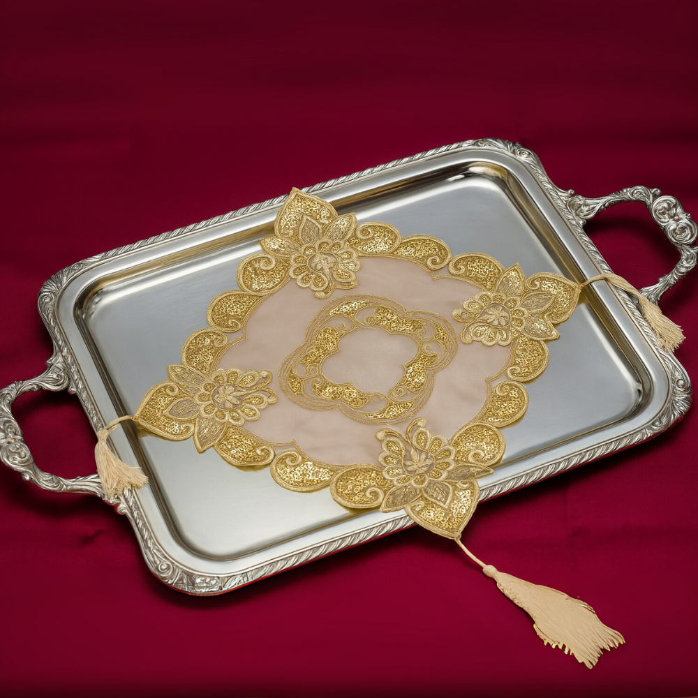 Elevate your hosting game with our Regal Sheer Gold Tray Cover, a masterpiece of elegance and fine craftsmanship. Featuring a luxurious sheer base adorned with intricate golden embroidery and sequins, this cover is designed to highlight the beauty of any tray. The ornate floral motifs and delicate tassels at all four corners add a royal touch, making it perfect for festive occasions, special serving setups, or gifting. Its golden accents stand out beautifully on metallic trays, adding instant grandeur to your table styling.