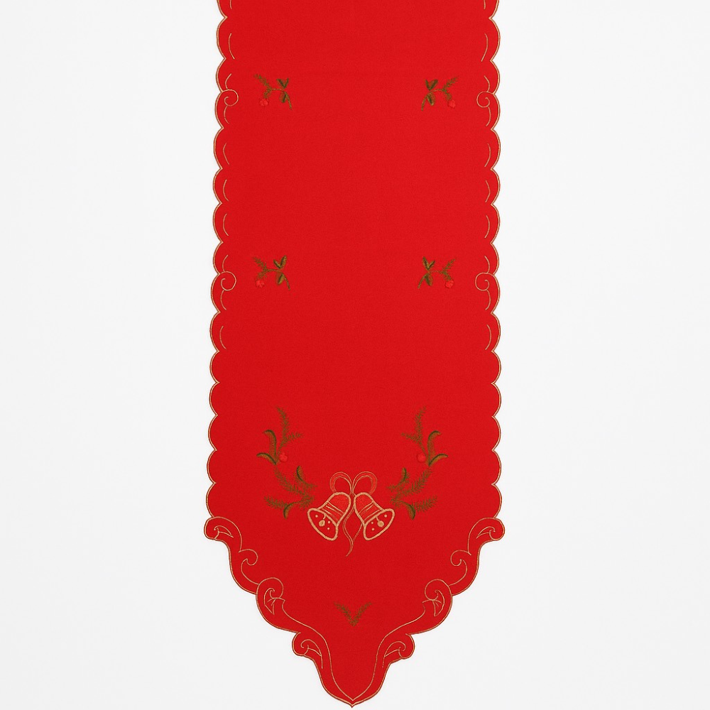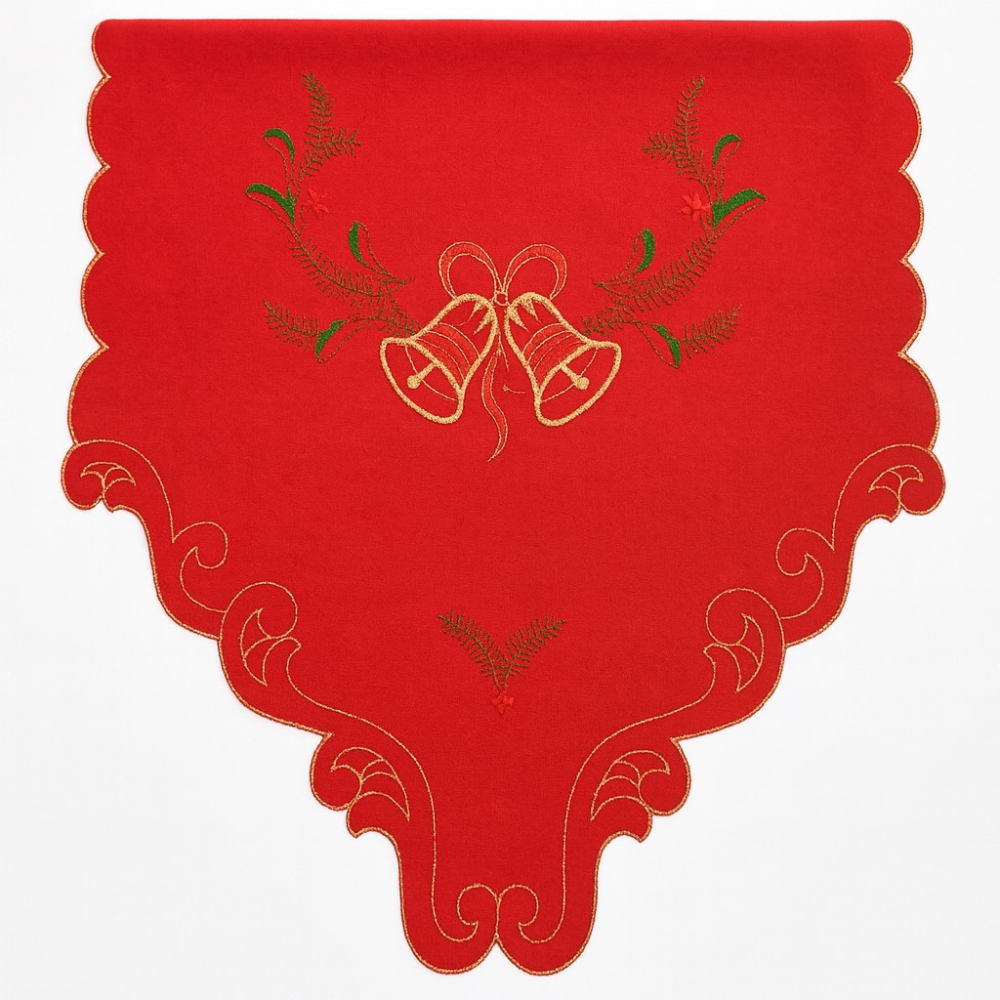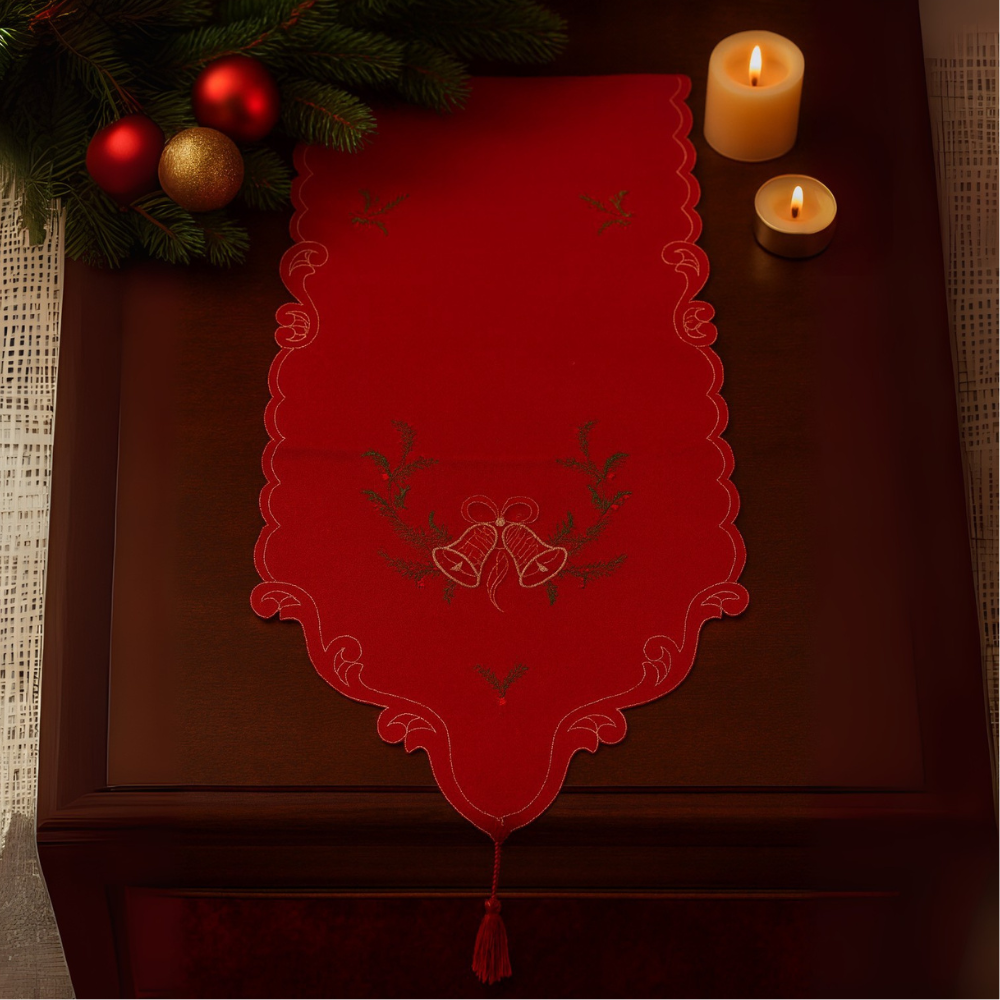 Bring the magic of the season to your table with the Scarlet Bells Christmas Table Runner. Crafted in rich crimson fabric, it features intricately embroidered golden bells tied with festive ribbons, surrounded by delicate green holly sprigs. The scalloped edges and tassel detail add a touch of timeless elegance, making it perfect for both grand holiday feasts and intimate festive gatherings. Designed to complement gold, silver, and neutral-toned tableware, this runner instantly elevates any setting into a Christmas masterpiece.